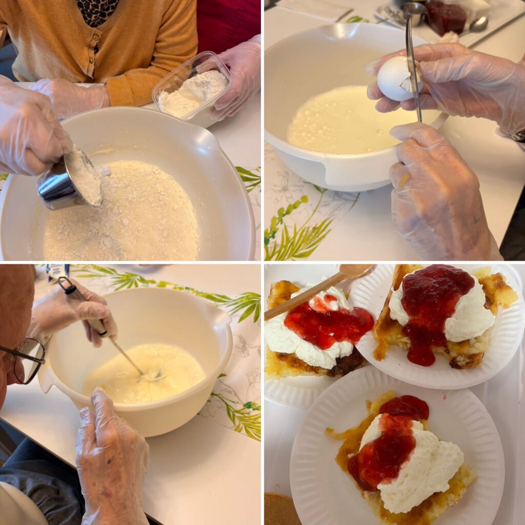 Asukkaat tekivät hoitajien kanssa herkullista pannukakkua ja kermavaahtoa.
